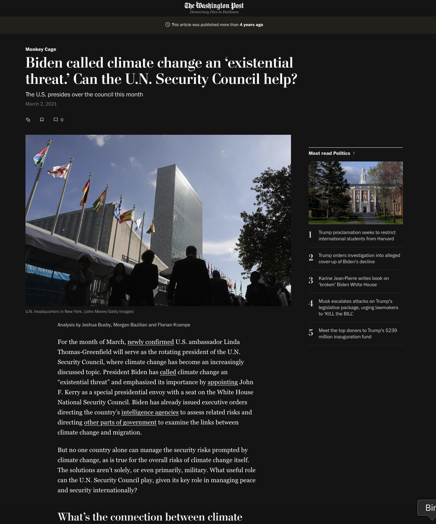 - Commentary: Analysis | Biden called climate change an ‘existential threat.’ Can the U.N. Security Council help? Washington Post. February 2021.
